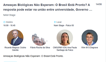 A Rio Innovation Week aconteceu no Píer Mauá, região central do Rio de Janeiro, entre os dias 12 e 15 de agosto de 2025 e contou com a participação do presidente da Comissão Técnica de Biossegurança e Bioproteção da Fiocruz (CTBio/Fiocruz), Dr Wim Degrave, que proferir uma palestra na mesa redonda intitulada: Ameaças biológicas não esperam: o Brasil está pronto?’. A mesa foi mediada pela assessora CT&I da Marinha do Brasil, Dra Ana Paula Santiago de Falco, tendo também a participação do Presidente do Conselho Nacional de Desenvolvimento Científico e Tecnológico (CNPq), Dr Ricardo Galvão, bem como do Dr Flávio Rocha, também membro da CTBio Fiocruz. A fala do Dr Wim abrangeu ensinamentos deixados pela pandemia de Covid- 19 e a mobilização institucional em áreas como: vigilância genômica e desenvolvimento de diagnósticos.